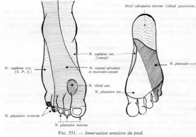 a) Les nerfs plantaire interne et plantaire externe innervent tous les muscles intrinsèques de la plante et commandent la flexion des orteils. Ilq régissent la sensibilité de toute la plante du pied.